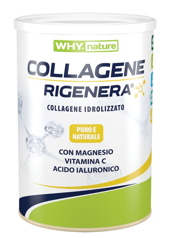 Il collagene è una proteina strutturale di fondamentale importanza per il corpo dal momento che concorre al benessere cellulare e alla formazione e alla riparazione dei tessuti. È’ il componente principale dei capelli, delle unghie, della pelle, così come dei legamenti, delle ossa e dei tessuti connettivi. Costituisce il 30% delle proteine corporee totali. Sfortunatamente la sua produzione diminuisce con l’avanzare dell’età, ed in particolar modo dopo i 25-30 anni. Collagene Rigenera™, a differenza dal collagene nativo è facilmente digeribile. E’ infatti ottenuto da collagene di tipo I e II attraverso un processo di idrolisi enzimatica che consente di ridurre la fibra di collagene in oligopeptidi di piccole dimensioni e quindi di basso peso molecolare. In virtù di questo, Collagene Rigenera™ è maggiormente biodisponibile e altamente assibilabile. Il prodotto contiene anche: vitamina C, magnesio e acido ialuronico. La vitamina C contribuisce alla normale formazione del collagene per la normale funzione delle ossa, delle cartilagini, dei denti e della pelle. Il magnesio contribuisce al mantenimento di ossa normali. Per godere dei benefici del Collagene Rigenera™ è fondamentale assumere 11 grammi di prodotto al giorno e seguire una dieta equilibrata. Collagene Rigenera™ è ottenuto da tessuto osseo e articolare di origine suina. MODALITÀ D'USO: assumere 1 misurino al giorno (11 g) disciolto in 250 ml di acqua, te, succo o latte, preferibilmente durante la colazione. Può essere assunto con bevande calde o fredde senza perdita di efficacia, anche se la solubilità è più rapida in liquidi caldi.